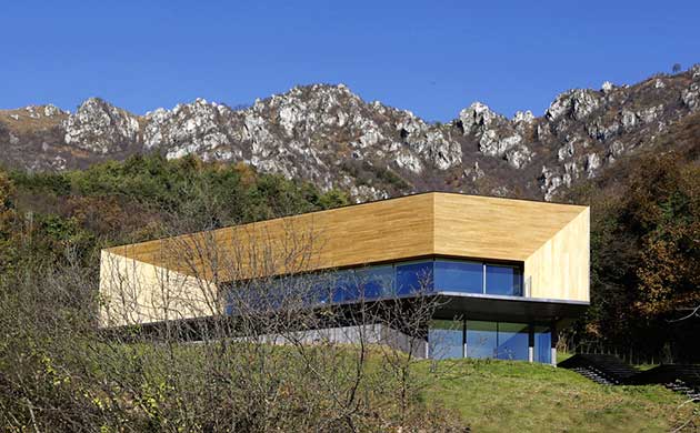 Alps Villa, Passo del Cavallo, Lumezzane (Brescia). La casa, progettata dall’architetto Camillo Botticini, è posta a 700 metri di altezza e sorge su una radura tra gli aberi (foto, ©Nicolò Galeazzi) |