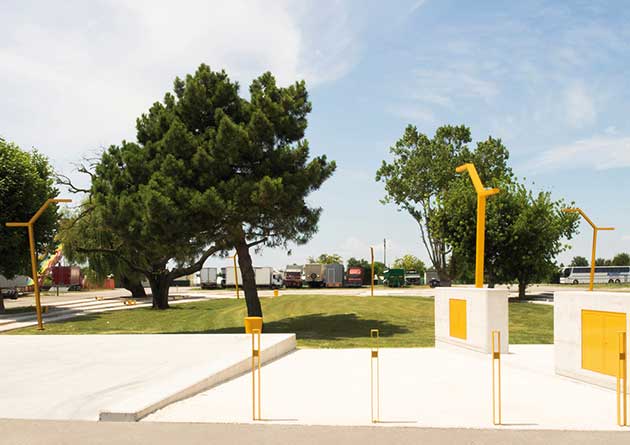 Naturalmente Arena, Cavallino Treporti (Venezia). L’intervento, progettato da Stradivarie Architetti Associati, è stato realizzato al centro di un’ampia area pavimentata che ospita un mercato settimanale all’aperto, lungo la più importante arteria cittadina (foto, ©Gianna Omenetto) |
