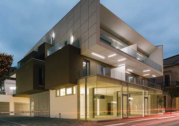 Palazzo di via Gramsci, Giulianova. L’edificio residenziale, progettato dallo studio Giovanni Vaccarini Architects, si trova nel centro storico della città, all’incrocio di due vie, segnato da un volume a sbalzo (foto, ©Sergio Camplone) |