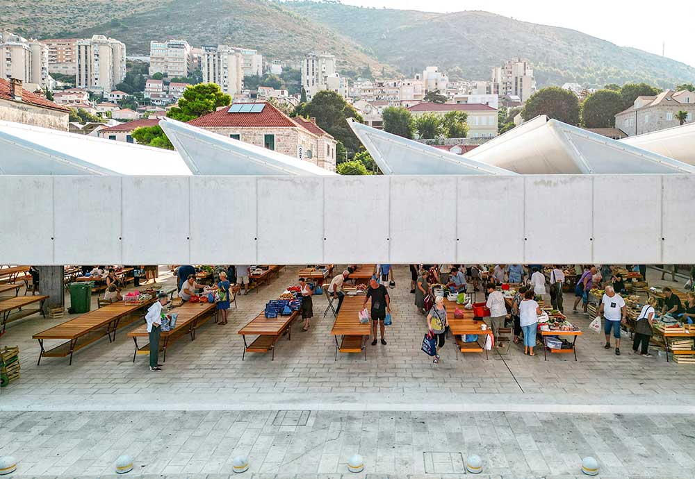 Nel centro storico di Dubrovnik gli architetti Dinko Peračić e Miranda Veljačić (studio ARP / Peračić-Veljačić) disegnano una tettoia regolabile leggera che articola le relazioni spaziali e sociali della piazza del mercato, che guadagna così una nuova identità pur rispettosa dell’eredità storica del sito.