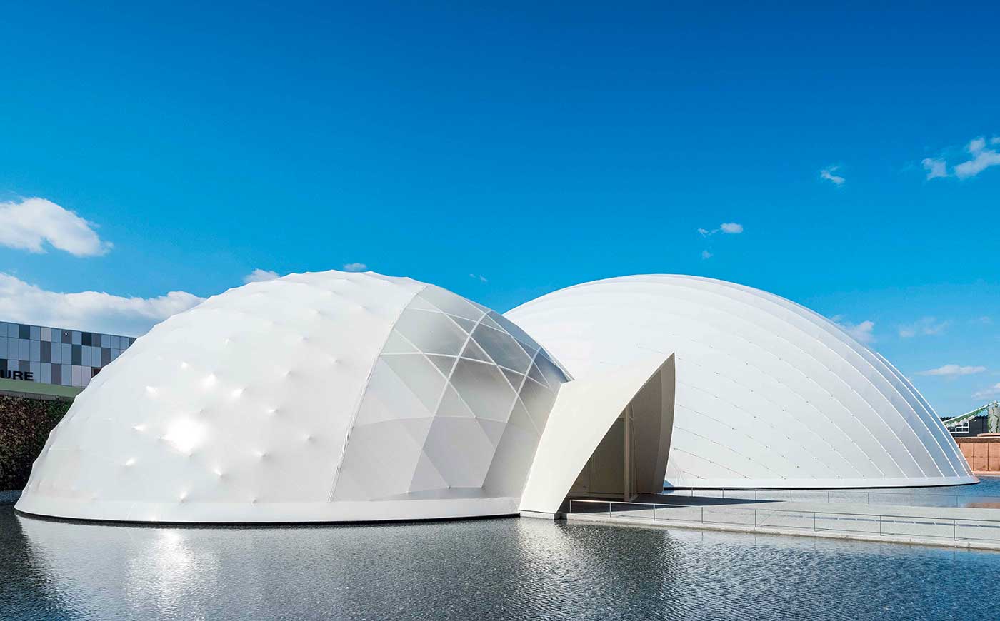 A Osaka Ban torna alla sperimentazione con la tre cupole del Blue Ocean Dome, le cui strutture sono realizzate con materiali estremamente leggeri come la plastica di fibra di carbonio rinforzata (Cfrp), fin qui mai impiegata – anche a causa del suo costo elevato – nel campo delle costruzioni.