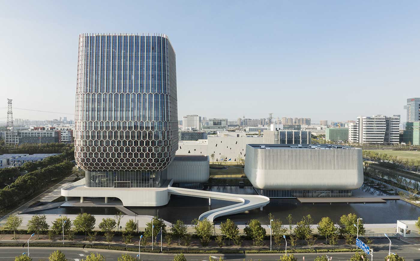 Motivo conduttore delle facciate è l’esagono, ispirato dal legame chimico delle sei molecole di carbonio e idrogeno che formano il benzene, alla base della ricerca di nuovi farmaci antitumorali portata avanti da Ascentage. Gli esagoni, modellati parametricamente e successivamente prefabbricati, caratterizzano tutte le facciate degli edifici, in nodi e estrusi di alluminio per la torre principale e in lastre di calcestruzzo ad alta resistenza negli altri casi.