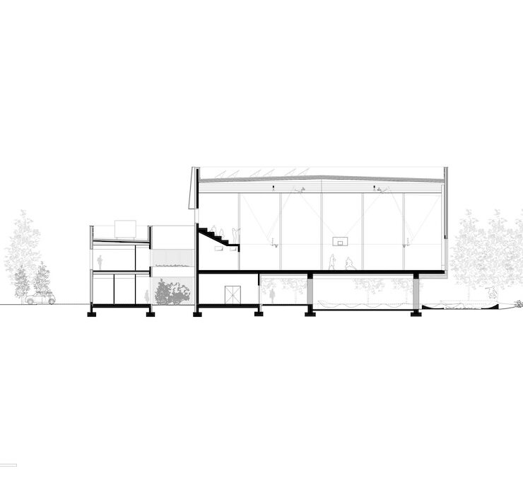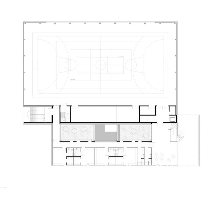 Il volume sospeso ospita la sala polivalente, illuminata da una fascia vetrata a sud e da un lucernario continuo a nord.