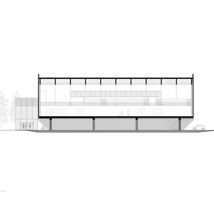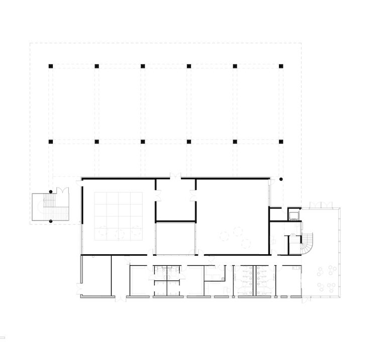 Al piano terra sono presenti due sale per attività specifiche, di pianta quadrata e con almeno una parete libera per attrezzature o installazioni, collegate direttamente all’esterno e al vicino parco commerciale. Un deposito condiviso adiacente incrementa la flessibilità d’uso.