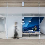 | Le soluzioni tessili Facid sono personalizzabili nel colore e nel grado di porosità e di sera possono darec luogo a giochi luminosi, come nel caso della sede di Gotha Cosmetics a Bergamo, nella foto |