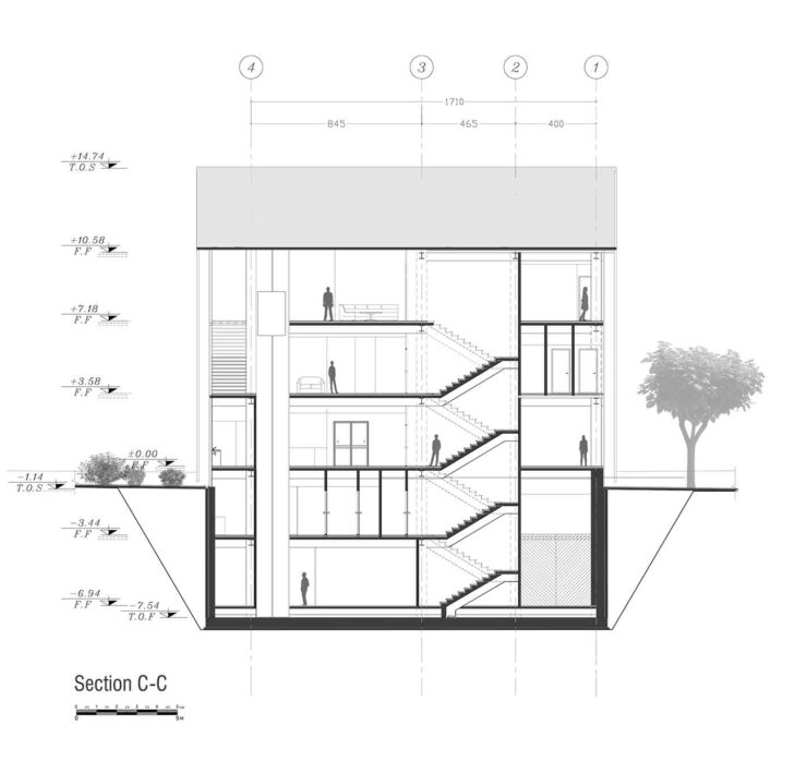 I piani – lo space planning è concepito per favorire le interazioni tra gli utenti dell’edificio – sono collegati da ascensori trasparenti.