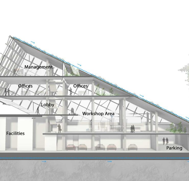 L’involucro in vetro è protetto da una gabbia esterna di profili di alluminio che oltre a caratterizzarne l’aspetto contribuisce a mitigare l’apporto solare pur assicurando ampia luminosità gli ambienti interni. Di più, sul prospetto dell’ingresso una parete fortemente inclinata delimita ambienti ombreggiati naturalmente dal volume superiore e contribuisce al tempo stesso a ombreggiare la piccola piazza vegetata esterna all’ingresso.