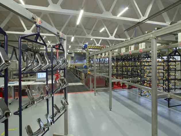Il sistema di bagno galvanico a 44 vasche, situato all’interno dell’innovativo polo produttivo dell’azienda novarese, è in grado di realizzare le finiture cromo, cromo nero, nickel e oro.