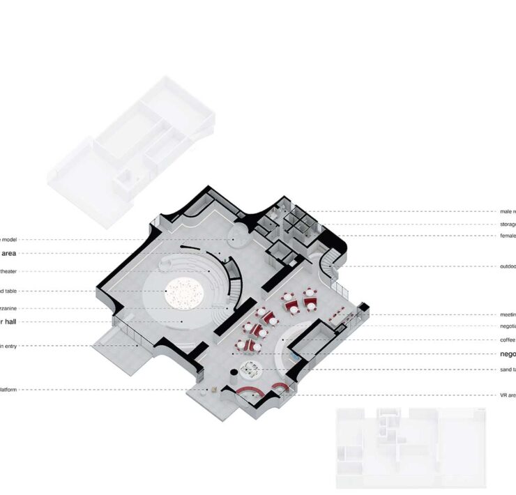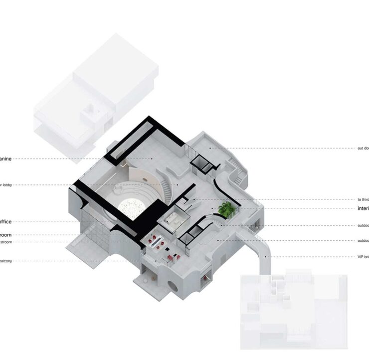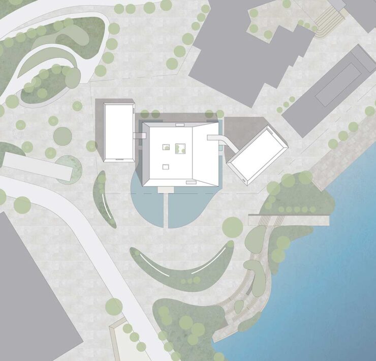 Da qui inizia un percorso che invita a salire, attraversando a est la caffetteria per raggiungere il secondo piano dedicato alle esposizioni e raggiungere infine un’area esterna dalla quale si diparte un ponte sospeso che collega due dei tre edifici.