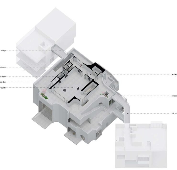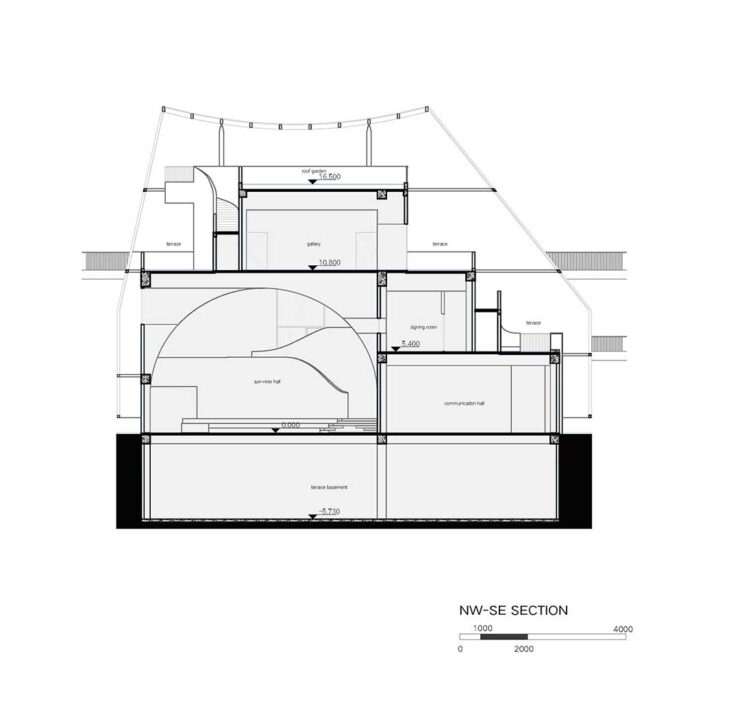 Libero da compiti strutturali e di riparo degli ambienti dalle intemperie, l’involucro tessile semitrasparente che conferisce leggerezza al complesso diventa un confine visivo e si richiama alla tradizione architettonica cinese che impiega strutture temporanee per espandere o ridurre la misura dello spazio in funzione delle diverse condizioni climatiche.