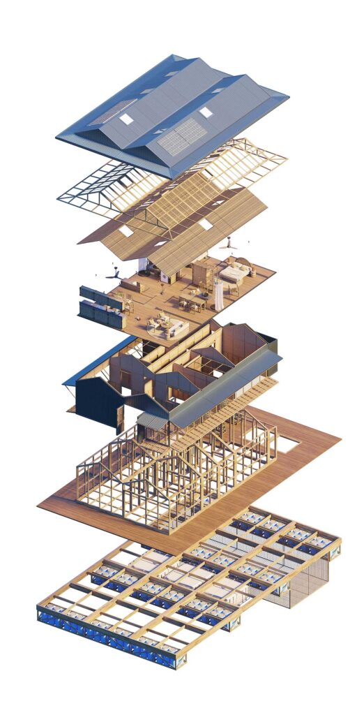 La struttura sarà poi elevata e poggiata su una zattera formata da barili di plastica riciclati, una soluzione intelligente e a basso impatto ambientale basata su risorse rinnovabili e recuperate, riducendo così l’impatto sull’ecosistema circostante.