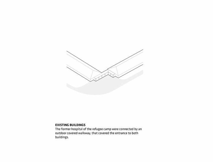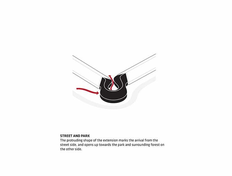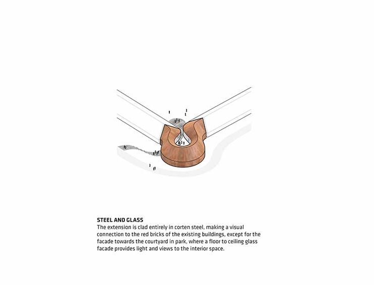 Sporgendosi verso la strada, la curva crea un invitante momento di arrivo per i visitatori. Il rivestimento in acciaio Corten dialoga con i mattoni rossi del vecchio ospedale.
