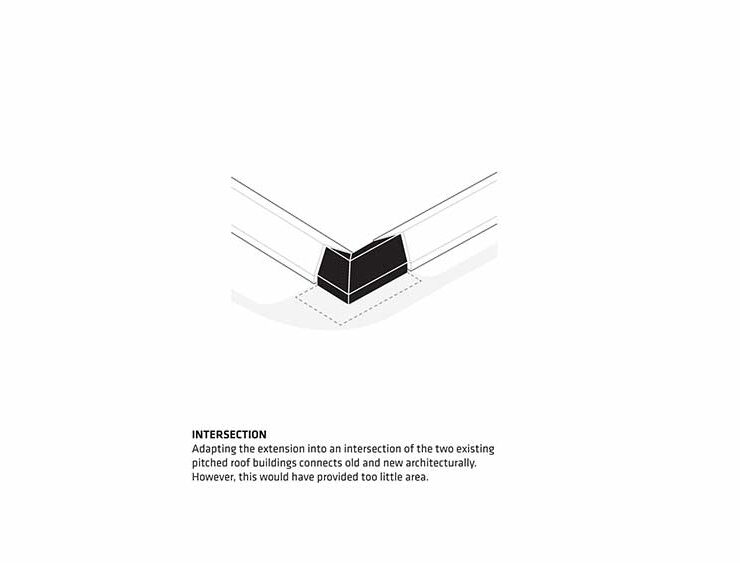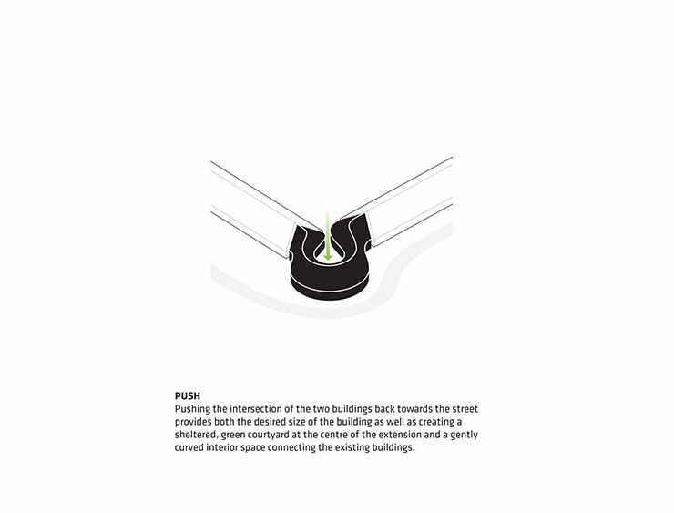 Un intervento architettonico rispettoso del passato dell’edificio collega tra loro i due corpi storici con un volume curvo ben visibile anche a distanza che crea uno spazio aggiuntivo di 500 metri quadrati.