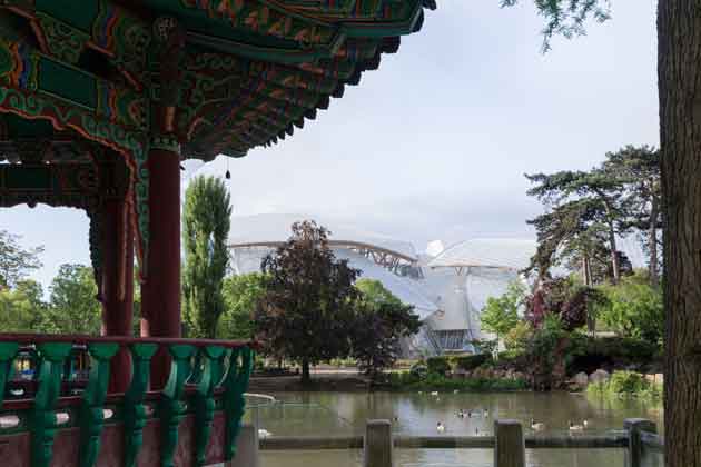L´edificio visto dal´adiacente Jardin d´Acclimatation (foto ©Iwan Baan per Fondation Louis Vuitton, 2014).