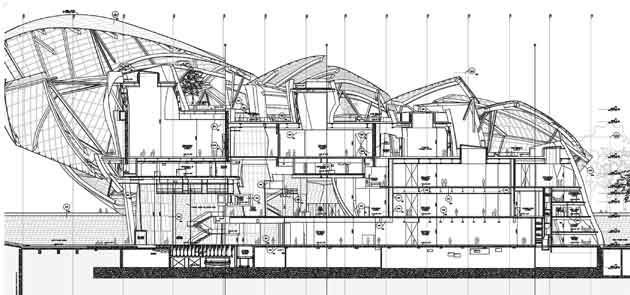 Per realizzare questi elementi di grande dinamicità che sembrano sfidare le leggi della fisica, il team di Gehry Partners si è avvalso della collaborazione degli studi francesi RFR e T/E/S/S, specializzati nella realizzazione di coperture vetrate – come quelle delle stazioni ferroviarie di Strasburgo e Avignone.