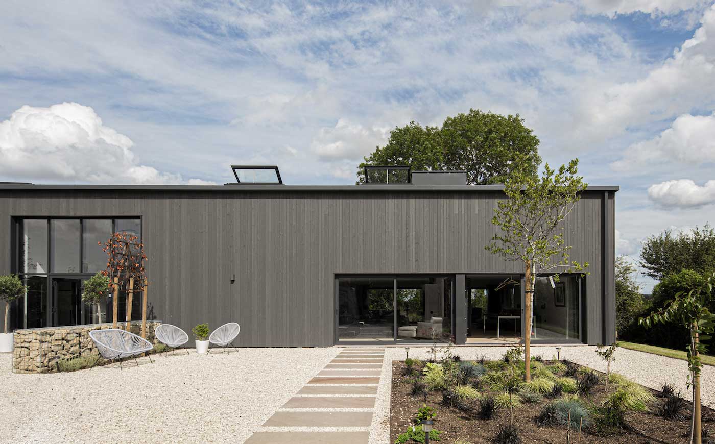Gli interni in stile nordico vivono su uno sfondo minimalista arredato con elementi di design italiano di Flexform, Poltrona Frau e Rimadesio. Un tappeto personalizzato, disegnato da Rigby & Rigby in collaborazione con Colbourns, circonda il camino e il salotto. Esternamente l’architettura è stata semplificata con un rivestimento in legno nero e alluminio.