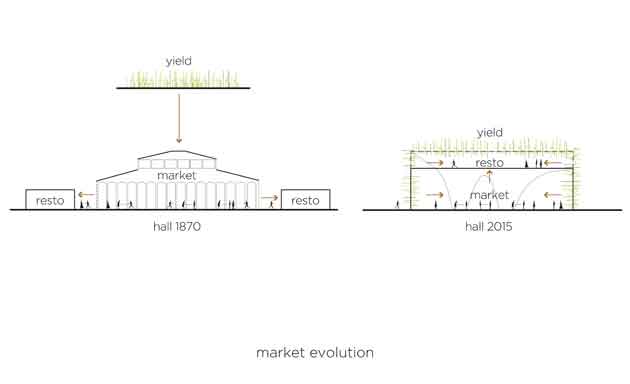 Una struttura ispirata ai mercati coperti delle Halles parigine. La copertura-paesaggio svela la varietà agro-alimentare d’oltralpe.