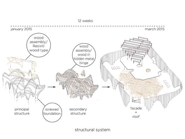 Il padiglione sarà all’avanguardia anche per quanto riguarda le tecniche di coltivazione fuori suolo: luppolo sulla facciata, erbe aromatiche sulla terrazza, frutta e verdura nei ristoranti. La complessa geometria del padiglione sarà interamente realizzata in legno proveniente dalla vicina regione del Jura francese, con tagli a controllo numerico, linee libere e assemblaggi nascosti alla vista. Un sistema di ventilazione e raffrescamento naturale e un sistema di tiraggio termico attraverso un lucernario posto al centro assicureranno un ridotto fabbisogno energetico.