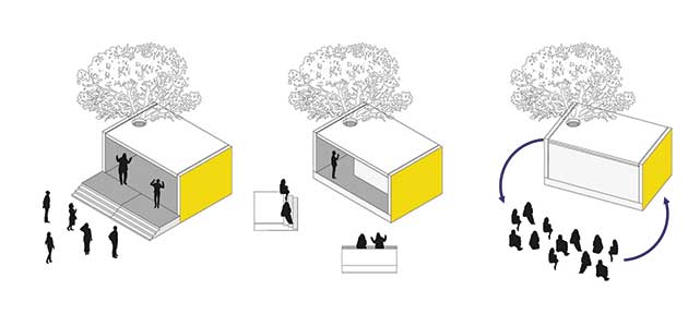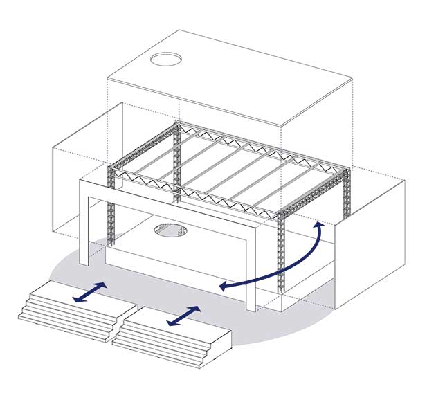 Un palco coperto, realizzato su misura, ruota facendo perno su un albero preesistente, inglobando l’elemento naturale nella progettazione. Il nuovo teatro mobile rende possibili molteplici configurazioni spaziali, grazie a un sistema di carrelli e binari che consente il movimento di due pedane laterali e delle quinte, davanti alle quali all’occorrenza viene fissato il telo per le proiezioni.