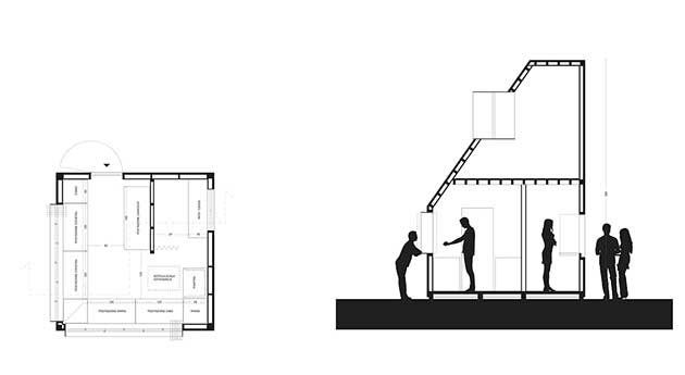 Pianta e sezione della torretta posizionata all´ingreso del Base (disegni Dontstop) |