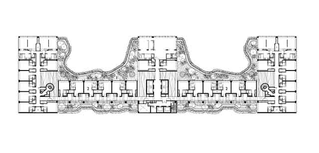 Al quinto piano un grande parco-giardino accessibile è dotato di piscine a sfioro, una Spa, una palestra, una terrazza  per eventi e cabanas colorate ispirate alle attezzature utilizzate dai pescatori locali. Da questo podio naturale/artificiale si ergono le tre torri che accolgono 367 camere e suites e che sono dotate di sei giardini-terrazze a U. I corridoi di distribuzione sono per il 40% all’esterno, schermati da spiante, in modo da ridurre la necessità di climatizzazione degli ambienti. Quasi tutte le stanze hanno la vista sulle terrazze o sul parco mentre gli spazi accessori e i servizi sono posti sul retro. Le pareti interne delle camere sono flessibili in modo da poter ottimizzare gli spazi a seconda delle necessità. I materiali sono stati scelti in un’ottica di sostenibilità ambientale, dalla vasca ai lavelli di granito in composto riciclabile, alle finiture in legno chiaro e in pietra dei corridoi.