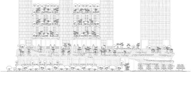 Tutti questi ambienti poggiano su una struttura basamentale di cinque piani sorretta da pilastri e caratterizzata dalla presenza di numerosi giardini pensili. Il complesso ha un orientamento nord-est al fine di ridurre il fabbisogno di raffrescamento artificiale e dispone di oltre 15.000 mq di skygardens, specchi d’acqua, cascate e terrazze fiorite per una superficie più che doppia rispetto all’area totale edificata.