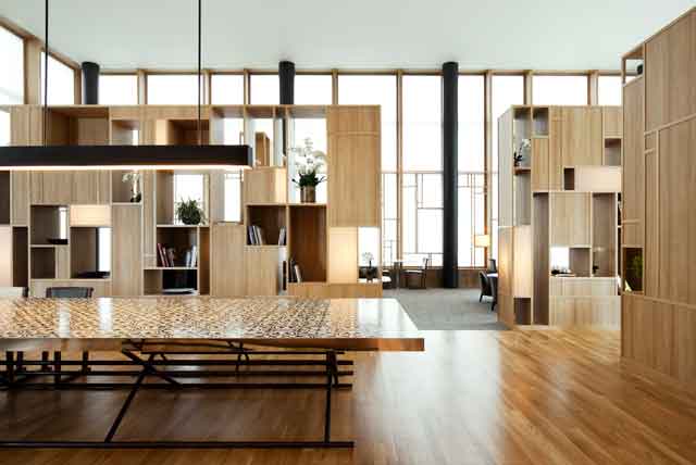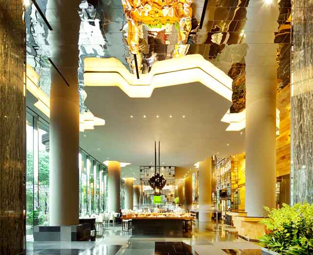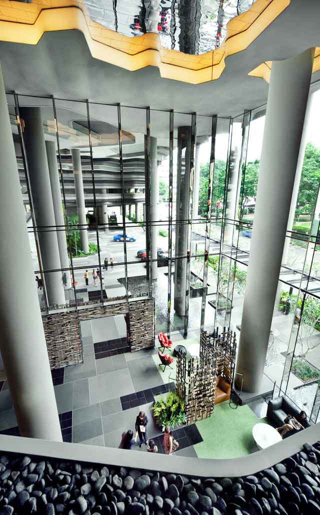 Al piano terra la lobby si affaccia direttamente sul parco Hong Lim ed è contraddistinta da pareti di legno inframezzate da piante e da alti soffitti che riprendono l’andamento curvilineo delle terrazze. L’utilizzo di superfici riflettenti per gli esterni della hall crea l’illusione di una facciata verde in continuità con il parco adiacente, mentre i pannelli a specchio dei soffitti interni amplificano la spaziosità dell’ambiente interno. Un piccolo corso d’acqua segue il perimetro interno accompagnando gli ospiti fino al ristorante, un grande spazio luminoso con vetrate affacciate sul verde. In questo primo blocco di cinque piani oltre alla hall si trovano meeting room alle quali si accede per mezzo di una scala a chiocciola.
