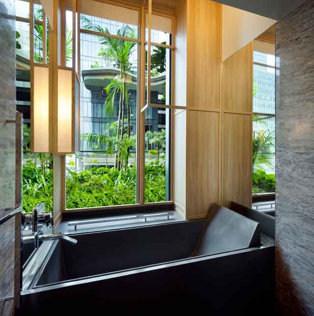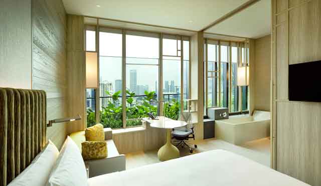 Sopra, il giardino del quinto piano con le piscine a sfioro e le cabanas decorative che si richiamano agli attrezzi da pesca locali, deluxe room con vista sulla città e il club lounge (foto ©Patrick Bingham-Hall)