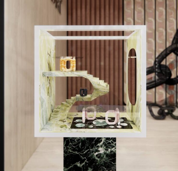 I Geodies di Patricia Urquiola non sono semplici elementi decorativi, ma come dice la designer «pietre di confine che permeano e si fondono con la struttura stessa di arredi e accessori. Qui, il vetro, lo specchio e il marmo si uniscono ai geodi, creando una sintesi materica, nella quale linee tradizionali si mescolano con le forme organiche e superfici lisce contrastano con le irregolarità naturali».