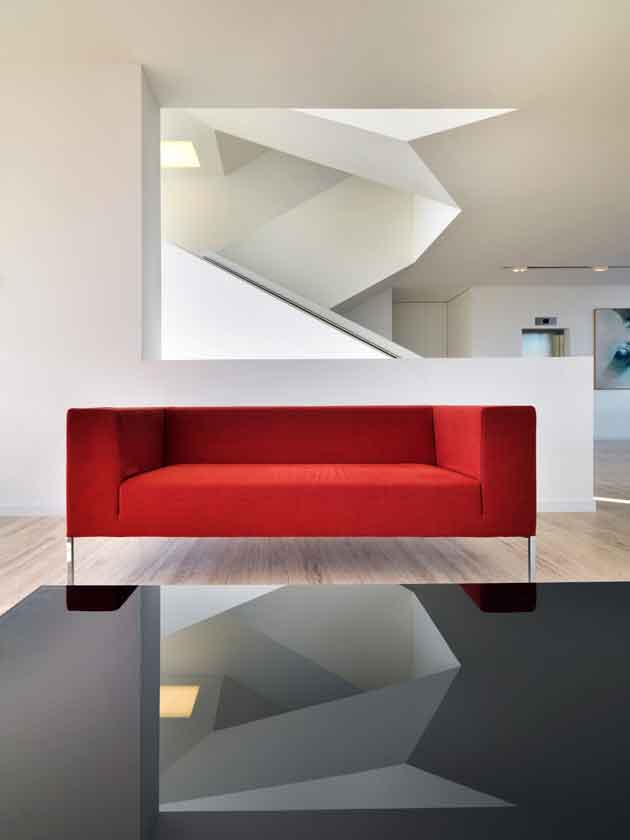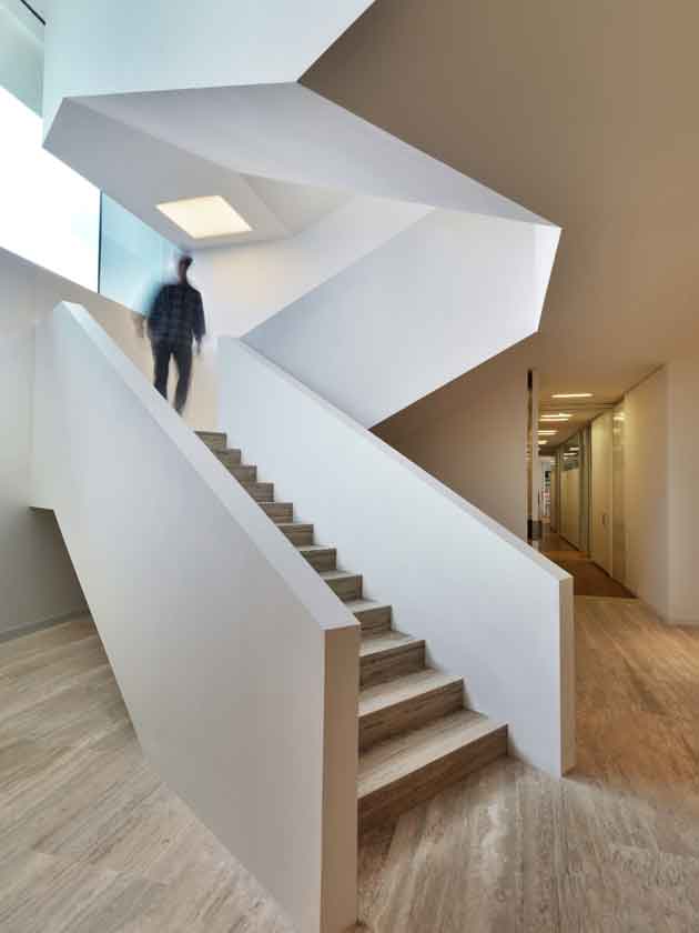 Questa soluzione compositiva rende la percezione dell’edificio un’esperienza continua di mutamento a seconda della posizione rispetto alla facciata e alla luce che durante il giorno la illumina, modellando con le ombre i volumi, e allo stesso tempo regala una sequenza di visuali dinamiche e cangianti della vita lavorativa interna. Il lato posteriore dell’edificio è progettato per mantenere una continuità visuale forte con la campagna circostante attraverso una facciata totalmente vetrata. Le due facciate sono diverse tra loro ma caratterizzate entrambe dalla volontà di apertura all’esterno attraverso la trasparenza, schermata sul lato verso la strada e aperta al paesaggio della campagna sul lato opposto. Separato dal corpo principale da una piazza ombreggiata e celato alla vista degli uffici da un piano verde inclinato, un capannone industriale accoglie infine i servizi, l’archivio e il magazzino.