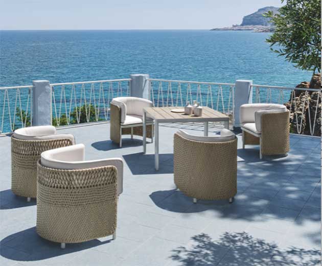 Dall’unione dell’alluminio e del teak con la fibra sintetica, realizzata con una speciale tecnologia che ricrea le sensazioni artigianali e di calore tipiche dell’intreccio in fibra naturale, sono nati gli accoglienti elementi dalla caratteristica forma a ‘C’ della collezione, capaci di suggerire nuove atmosfere di relax en plein air.