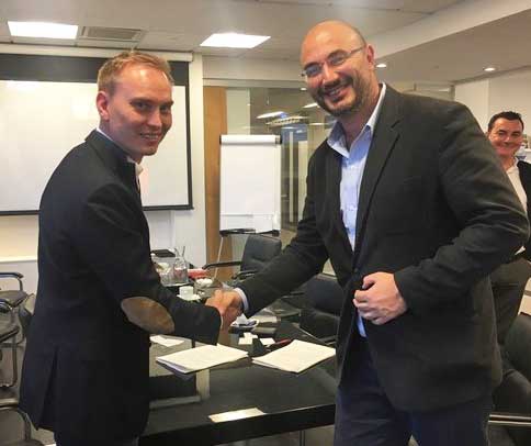 Stretta di mano alla sigla dell´accordo tra il rappresentante di Välinge e l´a.d. di Ges Group Cristian Donini |