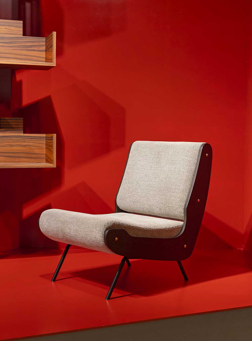 Il colore rosso mattone, ispirato al vocabolario cromatico di Gianfranco Frattini, stabilisce un legame diretto con il suo design. Ne risulta un allestimento essenziale e compatto, in cui contenitore e contenuto dialogano, restituendo allo sguardo uno spazio di attenzione e concentrazione sul progetto.
