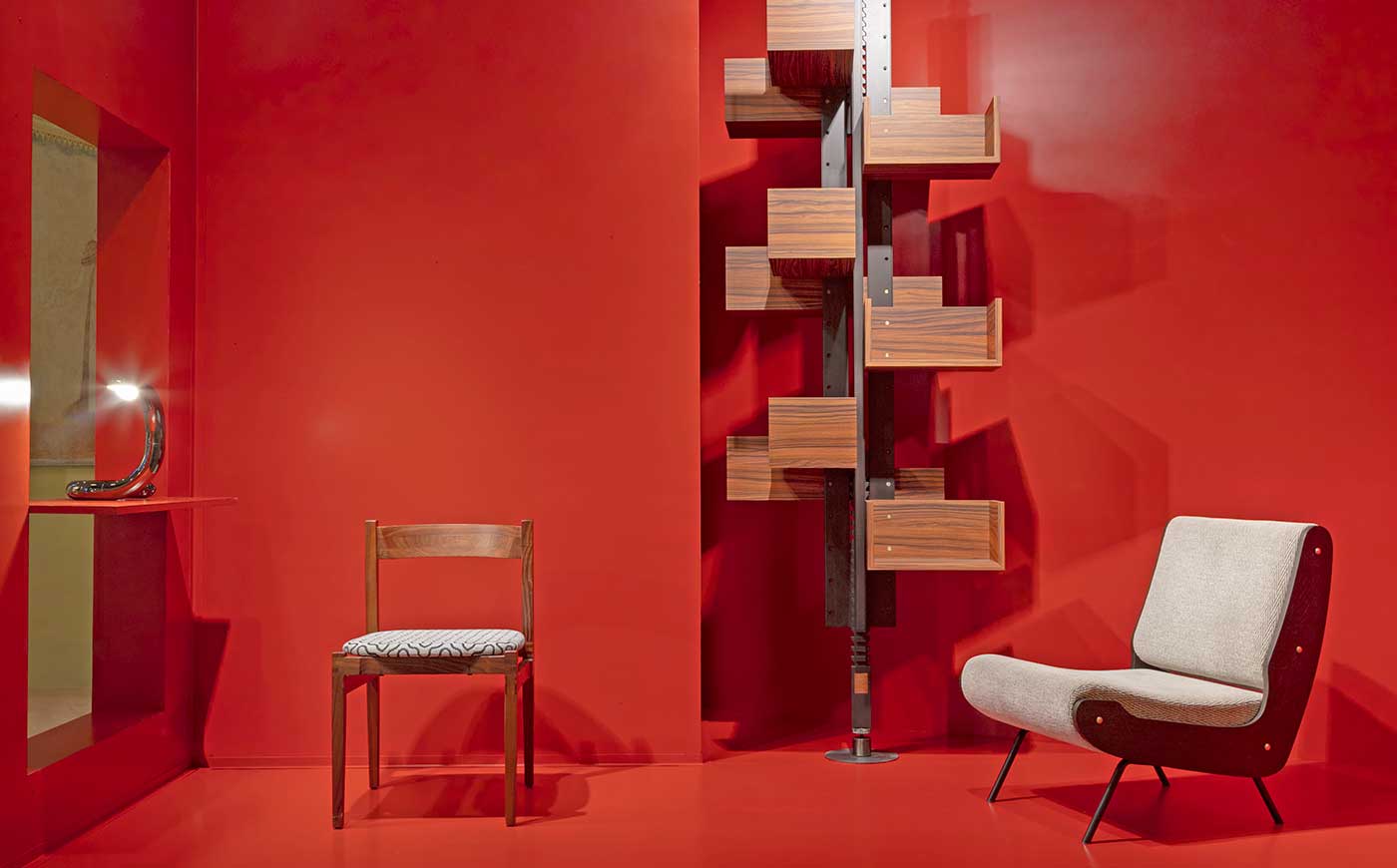 Il colore rosso mattone, ispirato al vocabolario cromatico di Gianfranco Frattini, stabilisce un legame diretto con il suo design. Ne risulta un allestimento essenziale e compatto, in cui contenitore e contenuto dialogano, restituendo allo sguardo uno spazio di attenzione e concentrazione sul progetto.