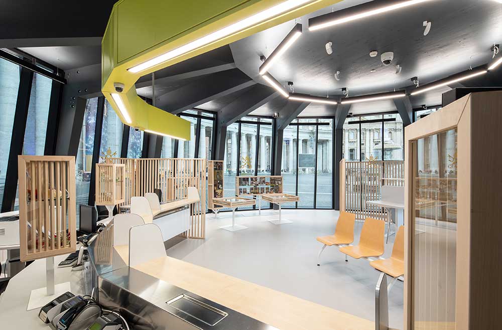 La piccola architettura – commissionata da Poste Italiane allo studio Amdl Circle di Michele De Lucchi e donata alle Poste Vaticane – è realizzata con un sistema prefabbricato progettato appositamente per garantire velocità di costruzione, qualità controllata del manufatto in fase di installazione, e ideata per integrarsi in modo rispettoso ma distintivo nel contesto grazie all’impiego di materiali nobili e antichi quali legno, bronzo e vetro.
