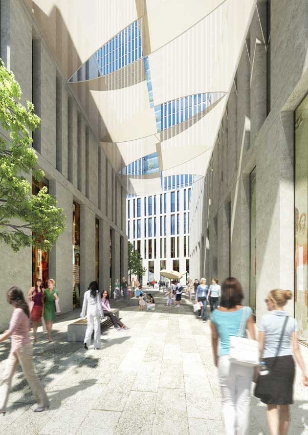 Le architetture in vetro e acciaio del distretto finanziario – per un volume edificato complessivo di 500.000 mq – si elevano al di sopra di cortine basamentali alte 4 piani rivestite in pietra, a cui in molti punti dello sviluppo si affiancano altri edifici alti 3 piani con funzioni di retail e ristorazione, per favorire il salto di scala ai livelli del passeggio e ricostruire fronti stradali mossi ma continui, diversificando al contempo gli spazi dello shopping, che a questi edifici su strada e a piazze di mercato affiancano spazi più moderni con shopping mall indoor.
