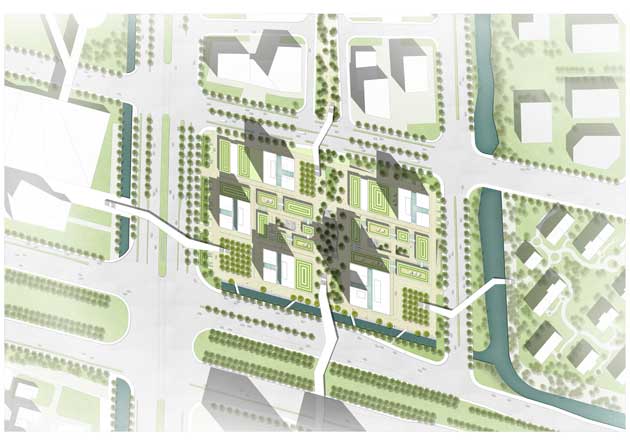 L’idea è di conferire al nuovo quartiere una precisa identità urbana attraverso due concetti-chiave: la creazione di un nuovo landmark visibile da lontano, con l’edificio più alto (415 metri) collocato esattamente all’incrocio dei due principali assi urbani; e la riproposizione in chiave contemporanea di un tessuto urbano simile a quello degli hutong, con stretti percorsi pedonali, piazze alberate, corti e recessi che si sviluppano alla quota di strada e la creazione di percorsi sopraelevati che attraverso ponti e passaggi collegano gli edifici più bassi ai quartieri vicini e offrono viste spettacolari sulle nuove torri.