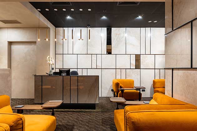 La collezione di Italgraniti Group scelta per il ristorante situato nella sala d’attesa e la business lounge è Beige Experience: il grès porcellanato effetto marmo che, reinterpretando la roccia naturale attraverso tonalità calde e delicate, ha saputo donare agli spazi luminosità ed eleganza. La tonalità Royal Beige, scelta tra le quattro disponibili, ha esaltato le venature e i movimenti cromatici, dando vita a un design dall’effetto contemporaneo. Delicati effetti tipo pietra si alternano a venature decise, offrendo a ogni singola lastra l’estetica di una materia preziosa.