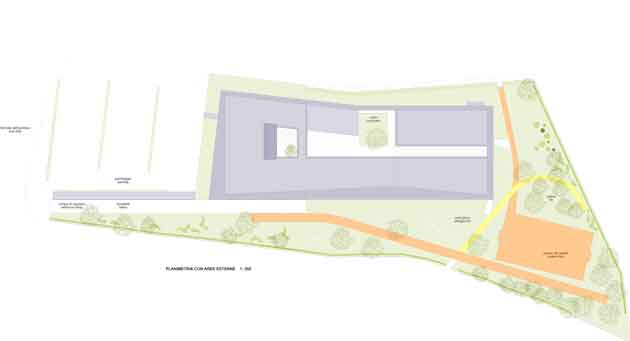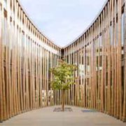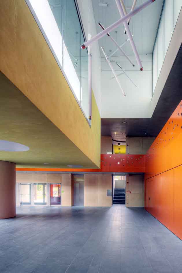 L´intonaco delle facciate non è stato tinteggiato ma mescolato con frammenti di pietra naturale e vetro per creare una superficie cangiante che fa da sfondo al legno dei tronchi, destinato nel tempo a ingrigirsi. Gli ingressi della scuola sono antitetici: il principale a est è un basso spazio trapezoidale che dal giardino si stringe verso l´interno, l´ingresso secondario a ovest è galleria stretta e alta. Entrambi conducono al cuore dell’edificio, una piazza centrale coperta che si apre a nord su un cortile interno. Una colonna funge da perno attorno a cui ruotano i diversi spazi e regge il volume sospeso dell´aula della musica. Stretti spazi a doppia altezza isolano l´ambiente dalle gallerie al primo piano permettendo un contatto visivo tra i due livelli dell´edificio. La fuga rivolta a sud si dilata verso l’alto formando un lucernario che cattura la luce riflettendola verso l’interno ed è rivestito all´esterno con lastre d´acciaio Cor-Ten. I setti portanti in c.a. a vista sono sovrapposti in parte da pannelli lignei che migliorano l’acustica degli ambienti, mentre le pareti che dividono le aule dai corridoi sono realizzate in legno. Le aree di distribuzione e la piazza coperta sono pavimentate in ardesia verde, utilizzata anche nella piccola corte centrale per sottolineare la continuità tra interno ed esterno. Le funzioni delle aule sono individuate dai diversi colori del pavimento in linoleum.