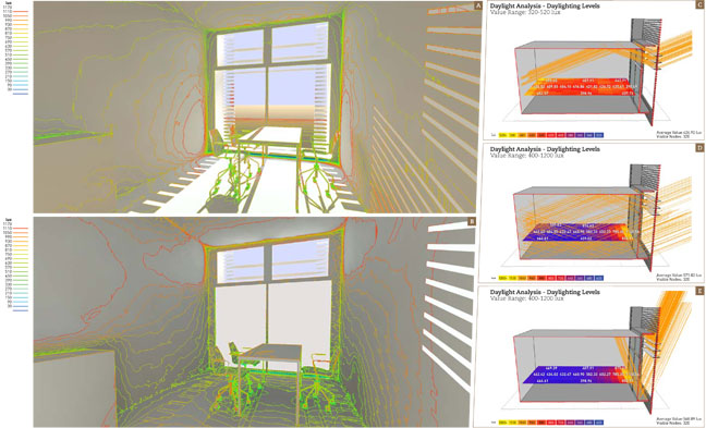 I due corpi laterali di H-Building sono caratterizzati da una speciale facciata schermante che controlla e modula la penetrazione dei raggi solari nei diversi periodi dell’anno. In particolare si prevede, davanti alla parete vetrata, un sistema costituito nella parte superiore da tre lamelle fisse in alluminio orientate in una posizione idonea a deflettere la luce e nella parte inferiore da un sistema schermante mobile. Tale soluzione permette di ostacolare nel periodo estivo l’ingresso della radiazione solare diretta (E), mentre nel periodo invernale, con l’astro più basso sull’orizzonte, garantisce l’ingresso dei raggi solari per aumentare i guadagni gratuiti (D). Inoltre, per evitare effetti di abbagliamento dovuti alla posizione bassa del sole sull’orizzonte, può essere utilizzato l’elemento schermante mobile. Tale soluzione non compromette comunque il livello di illuminazione nell’ambiente grazie alla presenza delle tre lamelle fisse che riflettono la luce sul soffitto, garantendo così il comfort visivo e il livello di illuminazione naturale (400 lux) richiesto dalla normativa sul piano di lavoro (C). |