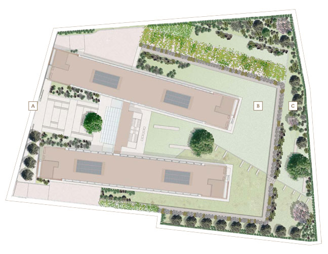 A – La corte aperta degli ingressi pedonali. La superficie esterna si articola in tre diversi spazi: la corte aperta degli ingressi pedonali, il giardino pensile sul quale si appoggia il volume dell’edificio e il giardino naturaliforme addossato al muro di confine del lotto. Caratterizzata da ampie vetrate trasparenti, la corte è stata concepita come elemento di transizione e sosta tra gli ingressi e il contesto urbano adiacente. Sedute in pietra, fioriere e una grande magnolia offrono allo sguardo un costante dialogo tra la vita dell’edificio e quella della città. |