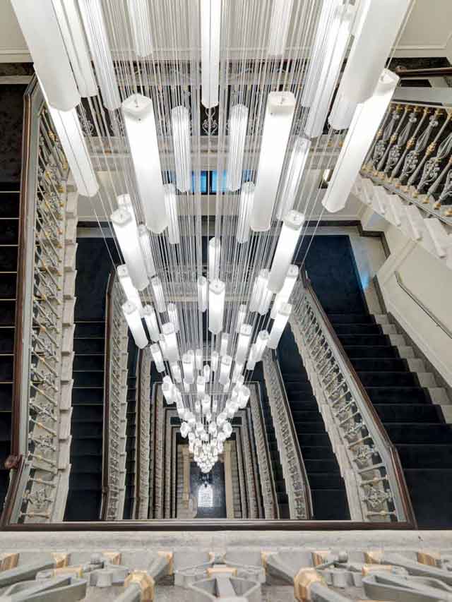 Lo scalone principale degli anni 30 è stato restaurato e restituito alla sua originaria monumentalità. Al suo interno, un lampadario iconico disegnato da Marco Piva, composto da 180 cilindri luminosi di vetro, si sviluppa sui 7 piani per un’altezza di 30 mt. (foto ©Andrea Martiradonna)
