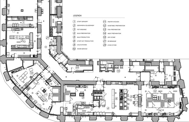 La pianta generale dell´area cucine che occupa circa 750 mq