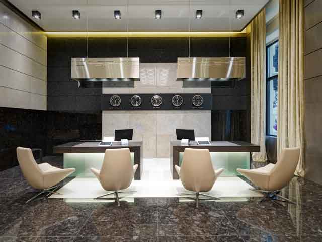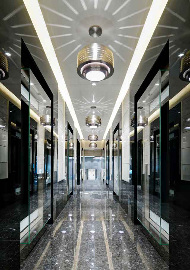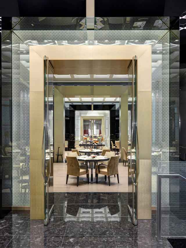 L’ottimizzazione dei layout distributivi garantisce efficienza e flessibilità ai 30mila mq del complesso ricettivo, creando ambienti magnificenti ma al contempo fluidi e funzionali. Dell’edificio storico è stata enfatizzata la monumentalità: una selezione di materiali durevoli per un lusso non effimero veste gli spazi comuni, lounge, bar, cigar room, ristorante e sala per banchetti. Una combinazione di marmi preziosi posati a casellario, vetri texturizzati e metalli tattili fa rivivere in chiave contemporanea l’atmosfera degli anni Trenta.
