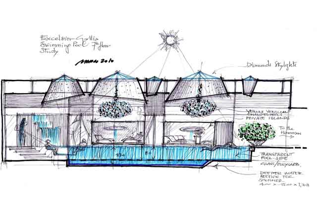 Un disegno della piscina panoramica di 15 metri situata al settimo piano della nuova struttura che offre un ambiente unico, con giochi d’acqua, solarium e juice bar. Rivestita in granito nero con finitura idrogetto con inserti lineari di luce che creano le corsie per il nuoto, è caratterizzata da skylight in vetro e acciaio a forma di diamanti. Una parete di fondo in lava con finitura platino crea magici giochi di luce
