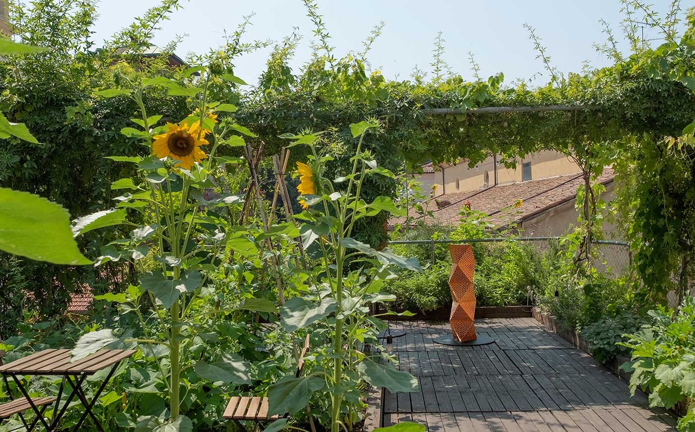 Tra le conseguenze di questo sfruttamento, la progressiva scomparsa degli insetti impollinatori a causa delle pratiche distruttive dell’agro-industria e dell’inquinamento ambientale è un tema ormai noto da anni. Così, in collaborazione con Apicolturaurbana.it e con una particolare attenzione alla qualità del disegno, dato il contesto della Design Week, piuarch ha disegnato una bugs home realizzando due prototipi installati nell’Orto tra i cortili, lo spazio all’aperto creato nel 2015 con il landscape designer Cornelius Gavril sul tetto della sede dello studio di architettura in via Palermo.