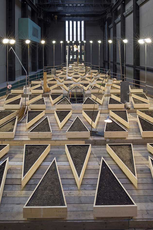 Con due piattaforme triangolari che sostengono una griglia geometrica formata da 240 vasi in legno, Empty Lot domina l’intero spazio (152 metri di lunghezza e più di 35 di altezza) della Turbine Hall. I vasi contengono 23 tonnellate di terriccio raccolto nei parchi e giardini di Londra e l’installazione è illuminata da una serie di lampade create dall’artista usando materiali provenienti dai rifiuti della capitale inglese. Allo stesso modo il terriccio non è seminato, così che la vegetazione che vi crescerà sarà spontanea.