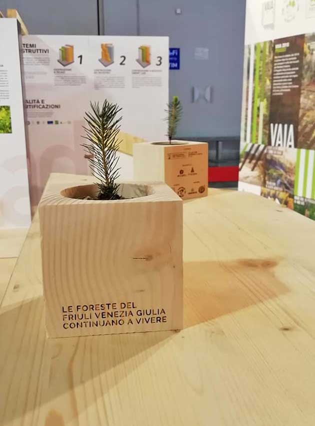 Quest’anno tutte le aziende del legno e delle costruzioni del Friuli Venezia Giulia presenti a MADE Expo esponevano un vasetto di legno contenente un arboscello di abete: è il progetto dall’elevato valore simbolico ‘Foresta viva FVG’ messo a punto dal cluster regionale Arredo/Casa e realizzato riutilizzando il legno degli alberi devastati dalla tempesta ‘Vaia’ che lo scorso ottobre aveva danneggiato importanti aree forestali della regione e dell’intero Triveneto.