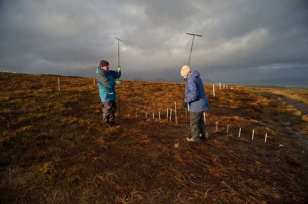 Gli archeologi Seamas Caulfield e Gretta Byrne con la sonda metallica per indagare la presenza di muretti sotto lo strato di torba. Fotografia di Andrea Rizza Goldstein per Fbsr, gennaio 2018. |