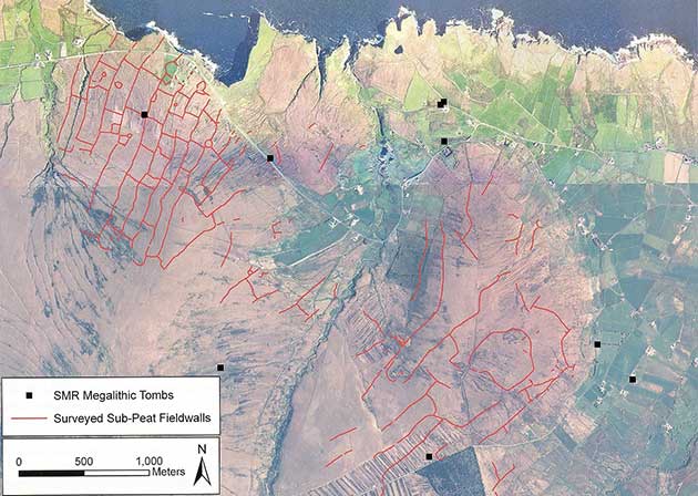 Mappa delle tombe megalitiche e reticolo dei muri neolitici dell’area di Céide Fields ©Seamas Caulfield. Ortofoto courtesy Mayo County Council © Ordinance Survey Ireland |